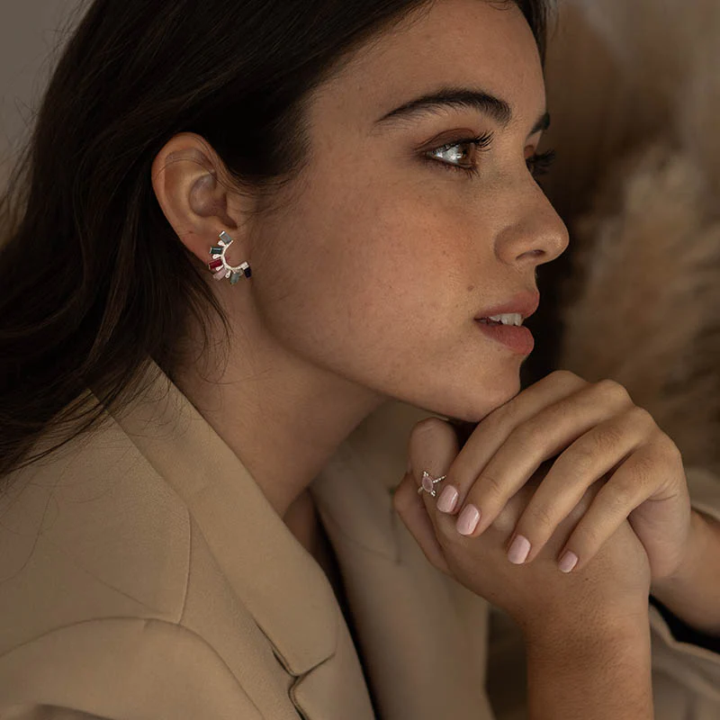 Pendientes en forma de semicírculo con pequeñas piedras rectangulares a lo largo del mismo. Un pendiente ideal para quien busque algo vistoso y original pero ligero y cómodo. Su innovador formato hará que resalten y son super versátiles, perfectos para dar un toque diferente a tus looks de diario o completar tu look de invitada.