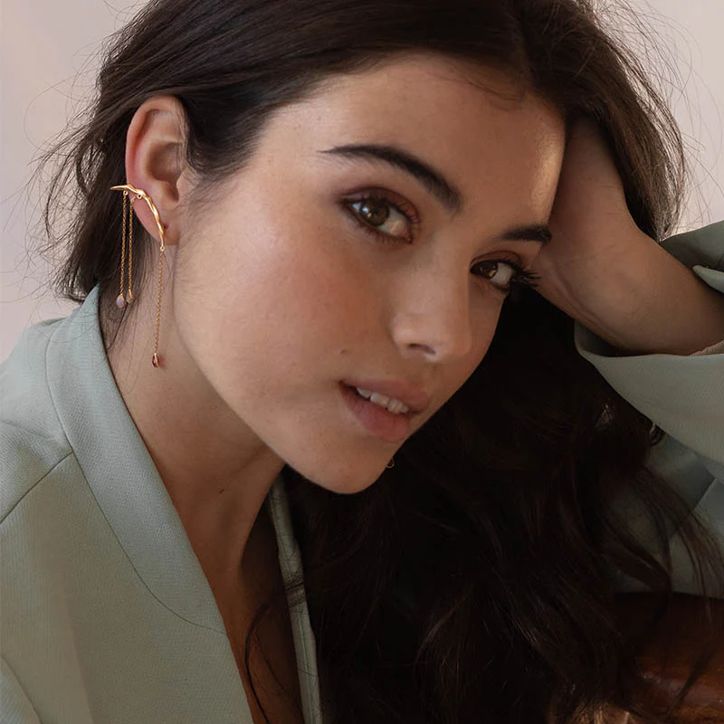 Elegantes y distintivos, estos pendientes en forma de arco despliegan tres finas cadenas, cada una rematada con una piedra en forma de gota. Un diseño sofisticado que añade brillo y movimiento a tu estilo con gracia y encanto.