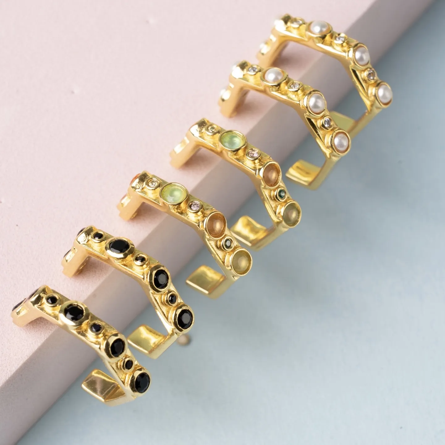 Pendientes dorados en forma de semi aro geométrico con piedras y circonitas incrustadas en su contorno. Un pendiente muy ligero y cómodo, perfecto para aportar un pequeño toque de brillo y color al rostro. Ideales para tus looks más básicos a los que quieras dar un toque algo más llamativo.