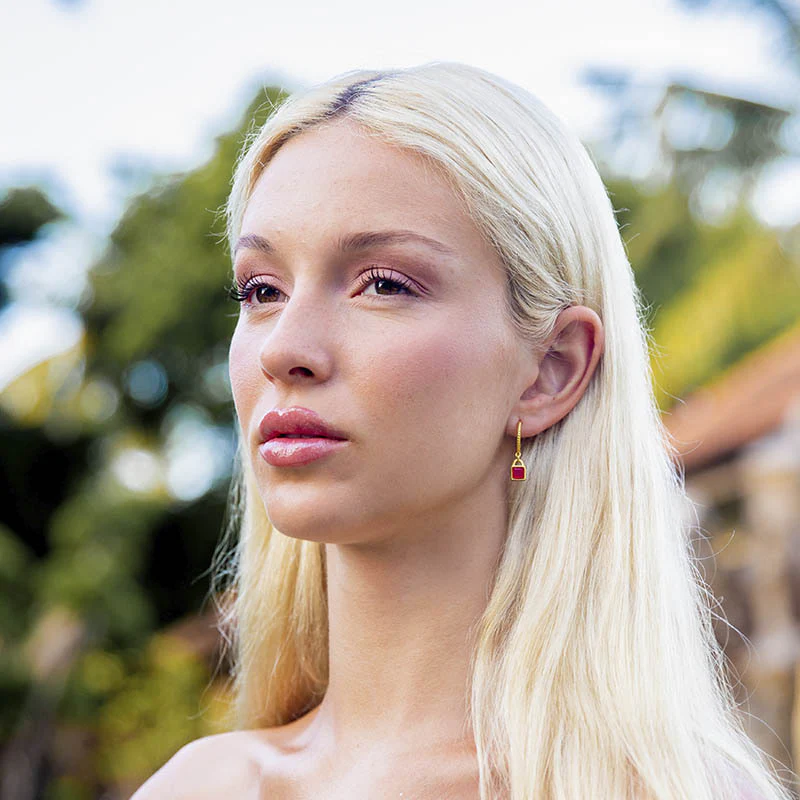 Pendientes en forma de aro con textura de circunferencias y un cuadrado de piedra colgante. Unos pendientes muy ligeros y cómodos, perfectos para aportar un pequeño toque de brillo y color al rostro. Ideales para tus looks más básicos a los que quieras dar un toque algo más especial.
