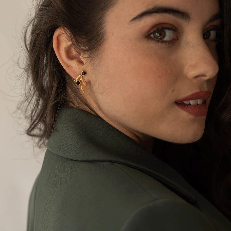 Pendientes formados por tres pequeñas hojas y dos piedras pequeñas circulares. Ideales como fondo de joyero y perfecto para tus looks de diario.