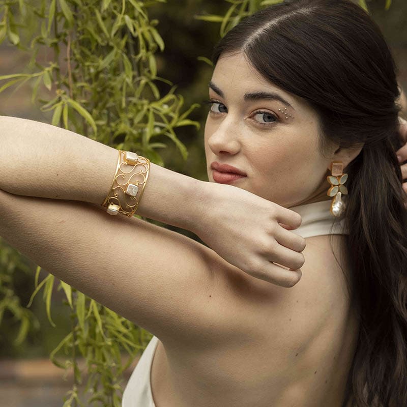 Brazalete formado por diferentes líneas con pequeñas perlas repartidas en su contorno. Un brazalete XL de estilo atemporal perfecto para completar y dar un toque diferente a tus looks de invitada. Es un modelo grande y muy vistoso que no dejará indiferente a nadie.