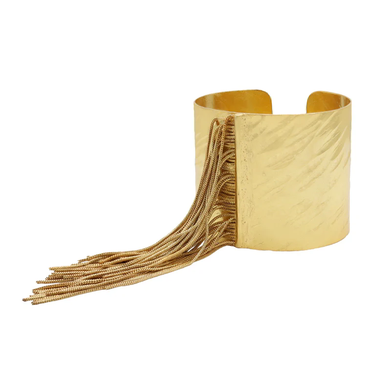 Brazalete rígido formado por una base opaca dorada del que se desprenden una ristra de flecos móviles.