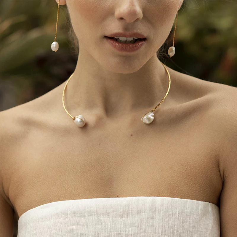Choker estático formado por una línea dorada de la que parten dos perlas barrocas en sus extremos.