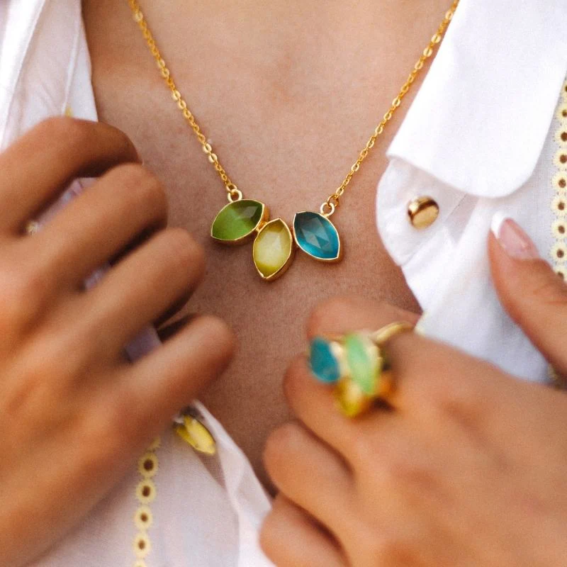 Colgante con tres piedras naturales de forma marquesa conectados creando una curva sutíl y elegante. Este colgante es la expresión perfecta de elegancia artística.