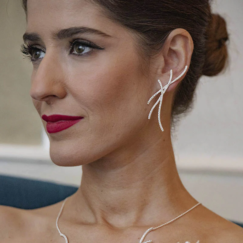 Pendientes con 3 hileras curvas de circonitas incrustadas que se entrelazan en su recorrido vertical.El resultado, unos pendientes únicos de diseño innovador que te sorprenderán.