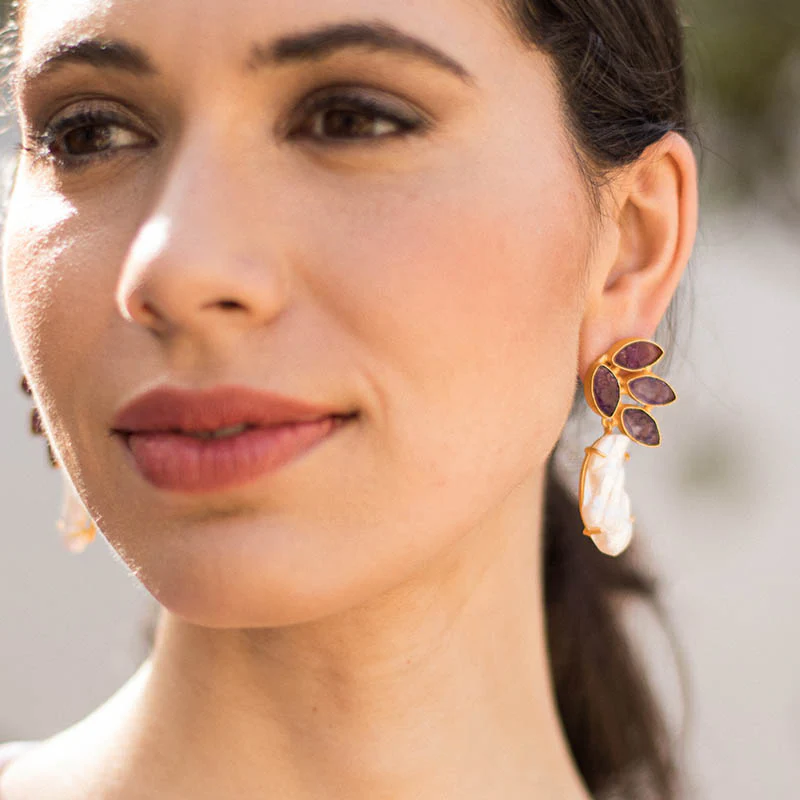 Cada pendiente presenta un racimo de cuatro piedras, cada una única en su forma y textura. Desde este "flor", cae una perla barroca de tamaño grande e irregular, añadiendo un toque de gracia y originalidad. Estos pendientes son una expresión de la belleza natural y la creatividad en el diseño. Luce esta joya que destaca por su combinación única de piedras y perlas, realzando tu estilo con una elegancia atemporal y un toque moderno.