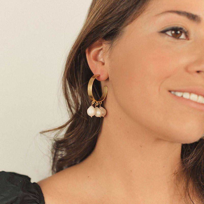 Pendientes de aro dorado con tres piedras colgando de la parte inferior. Un modelo que te aportará luz y movimiento, ideal para tus looks más boho o para la feria.