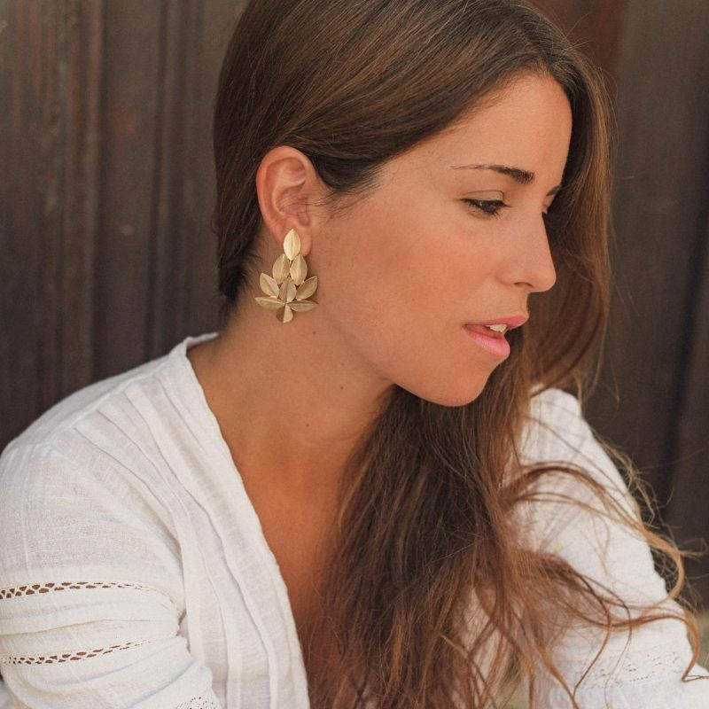 Pendientes formados por nueve hojas doradas artesanales creando una bonita composición. El diseño se curva, creando el efecto de llevar unos semiaros.